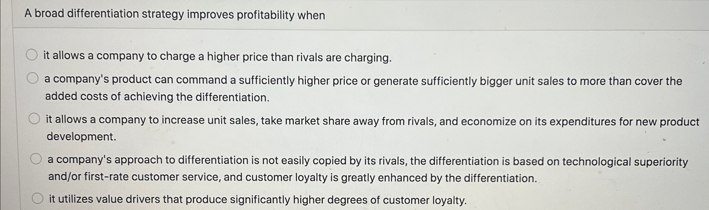 A broad differentiation strategy improves profitability when: The higher price the product commands. A broad differentiation strategy improves profitability when: It is focused on product innovation b. A broad differentiation strategy improves profitability when meaningful lower overall costs than rivals.