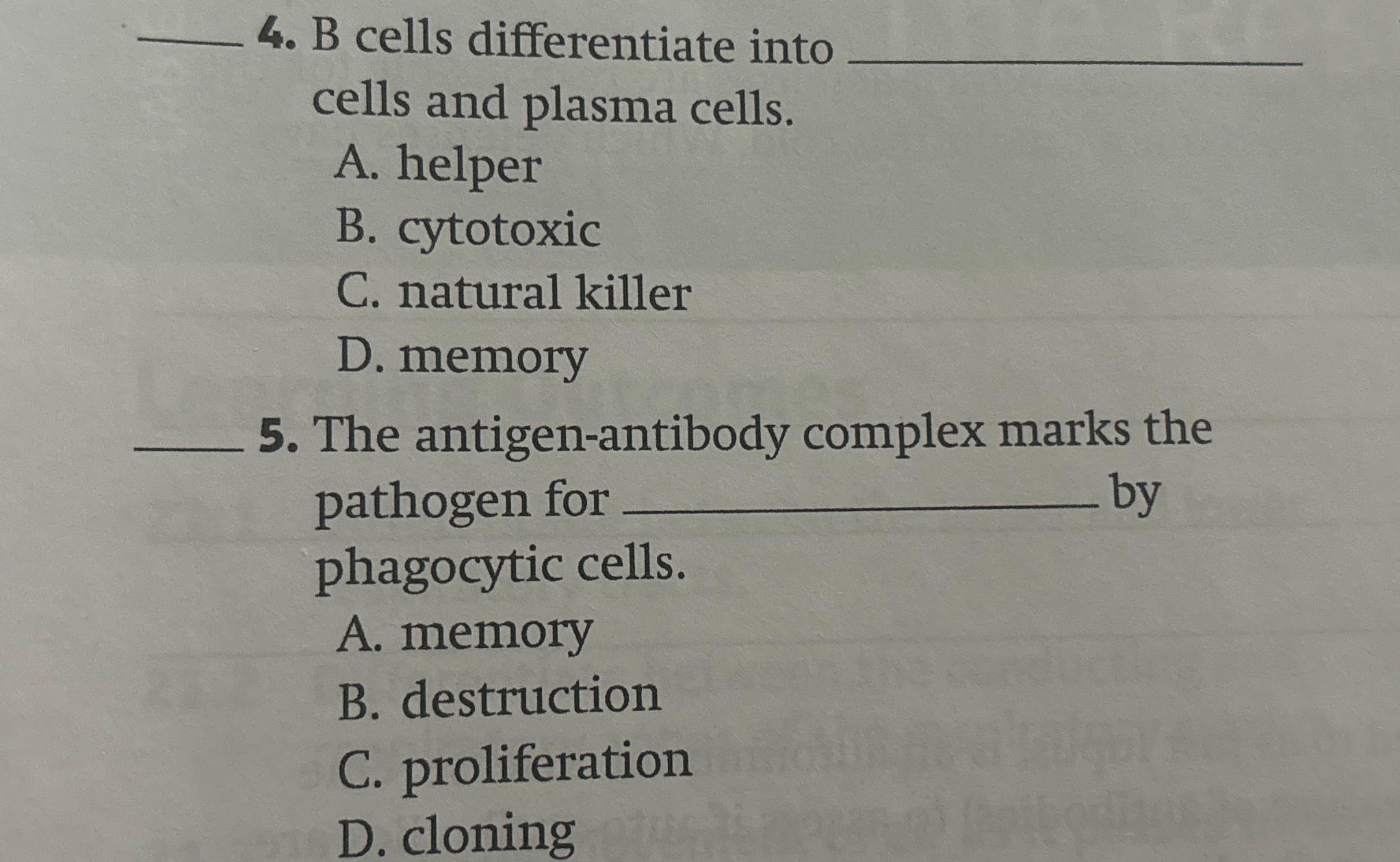 Solved B cells differentiate into cells and plasma cells.A.