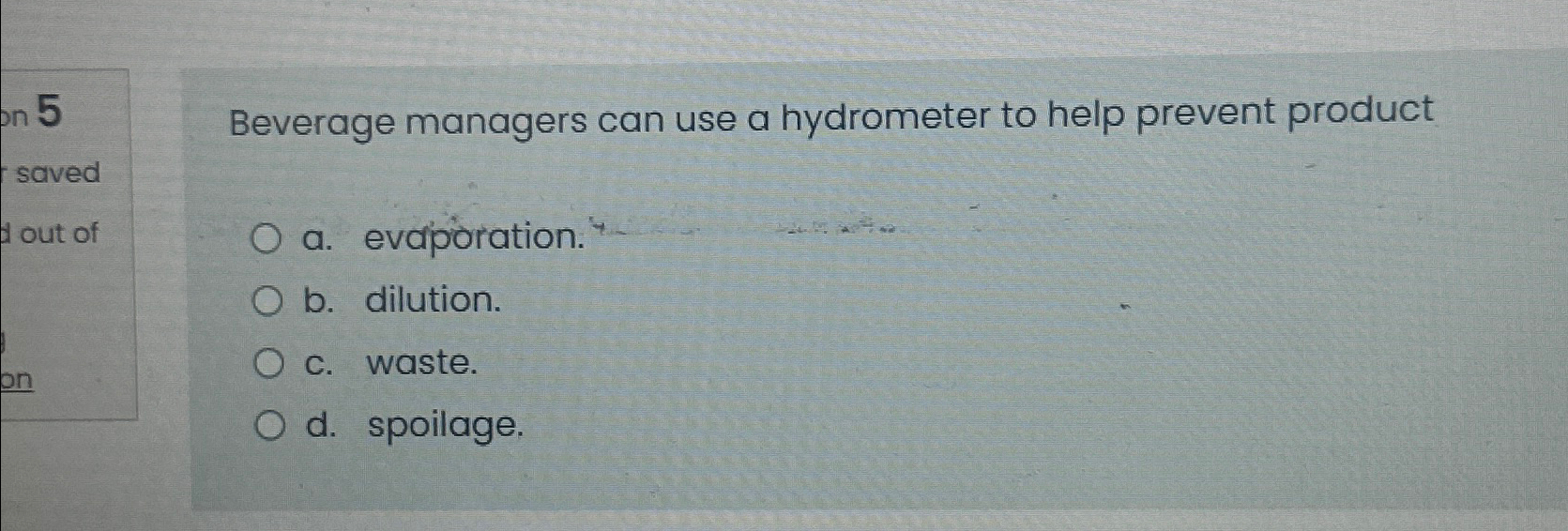 The hydrometer helps beverage managers prevent dilution by measuring the specific gravity of. A manager's standardized recipe for chili cost $56.00 to produce. What is the formula managers use to compute food cost percentage? Additionally, a hydrometer can be used to monitor the sugar content of beverages. Beverage managers can use a hydrometer to help prevent.