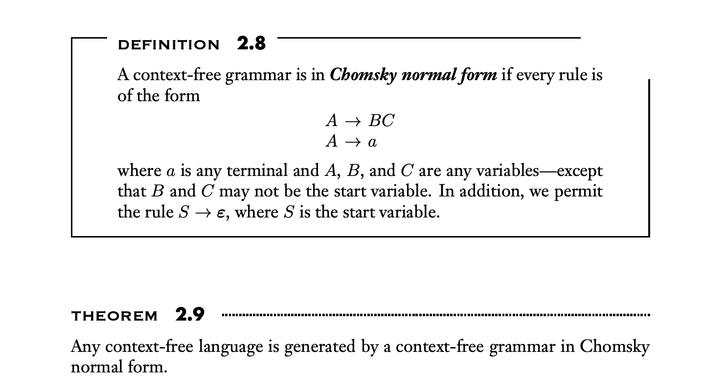 A website to convert context free grammar(cfg) to equivalent chomsky normal form(cnf) This converter was created from the construction given in theorem 2.9 (page 109) of introduction. Try converting the given context free grammar to chomsky normal form. How to convert cfg to cnf? Eliminate start symbol from rhs.