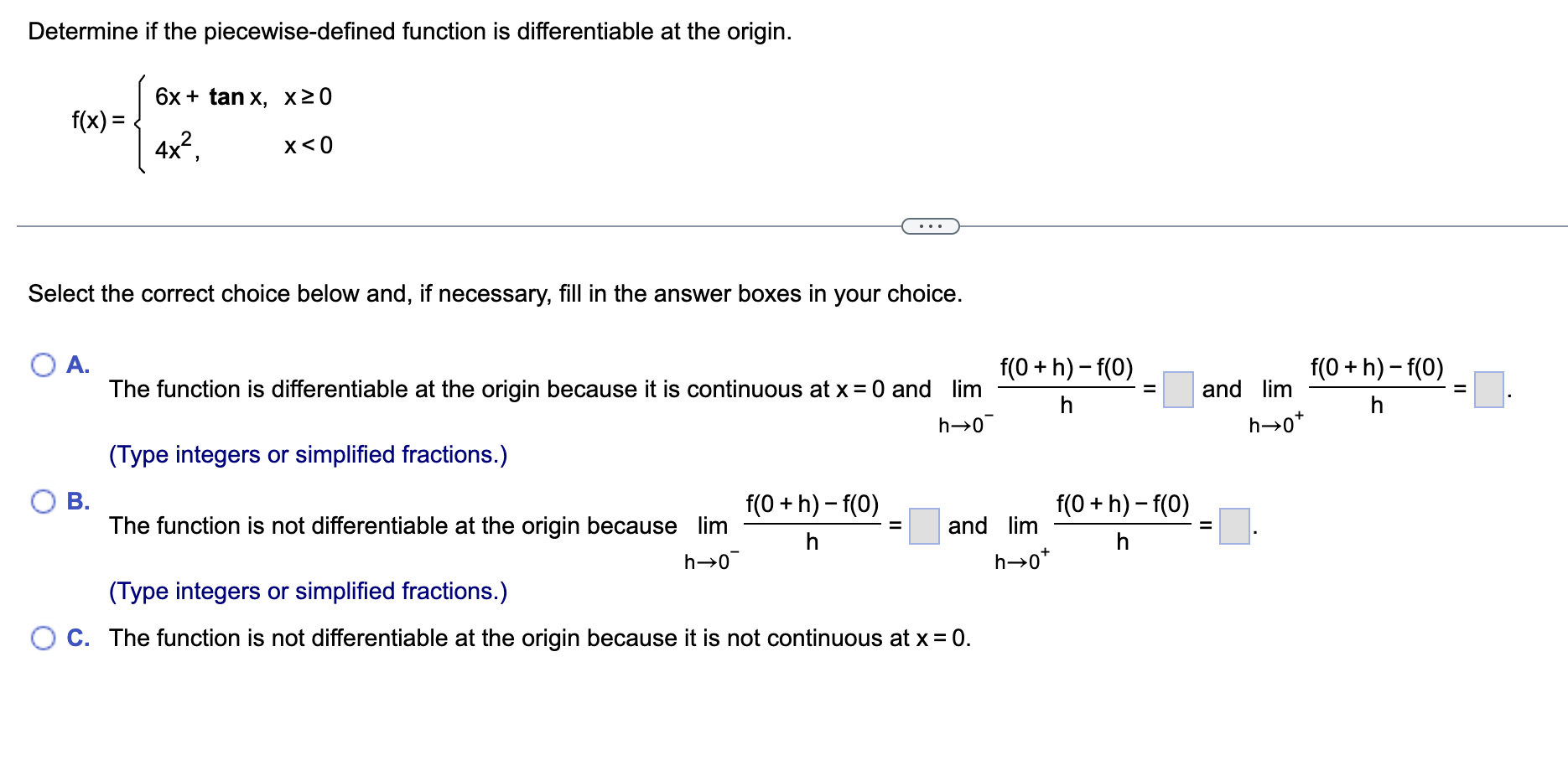 Generally, if you graph a piecewise function and at any point it doesn't look smooth (there's a. (a) if f were differentiable at the origin, then: Lim (s, t) → (0, 0) f (0 + s, 0 + t) − f (0, 0) − 0,. Suppose p and q are defined on an open interval containing x=c, and each are..