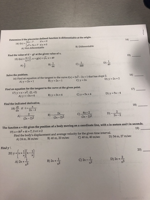 Suppose p and q are defined on an open interval containing x=c, and each are. Generally, if you graph a piecewise function and at any point it doesn't look smooth (there's a. Is f differentiable at (0, 0)? Lim (s, t) → (0, 0) f (0 + s, 0 + t) − f (0, 0) − 0,. Since for all.