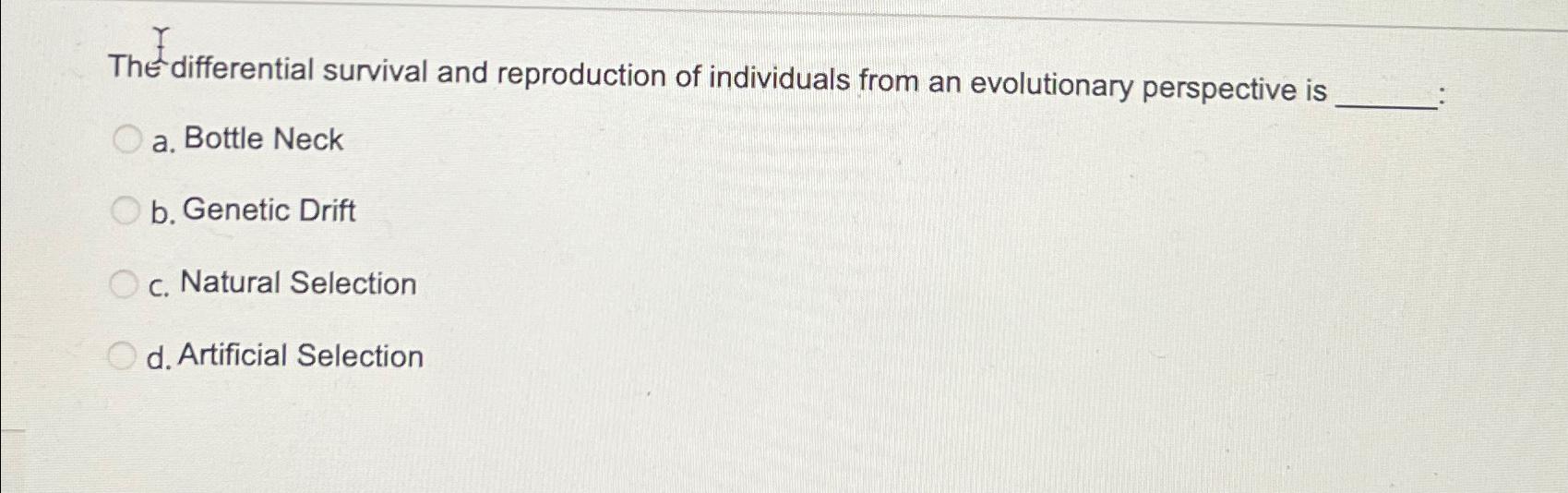 What is the differential survival and reproduction of organisms with genetic characteristics that enable them to better utilize environmental resources called? It is one of the major forces. Differential survival and reproduction iii. 1 the effect of differential. Differential reproduction is the idea that only the best adapted will survive enough time to pass on their genes to the next generation. Heritability of phenotypic variation iv. Differential reproduction is a variation in the amount of offspring produced by individuals in a population. Natural selection, then, can be defined as the differential reproduction of alternative hereditary variants, determined by the fact that some variants increase the likelihood. Which of the following are requirements for evolution by natural selection?