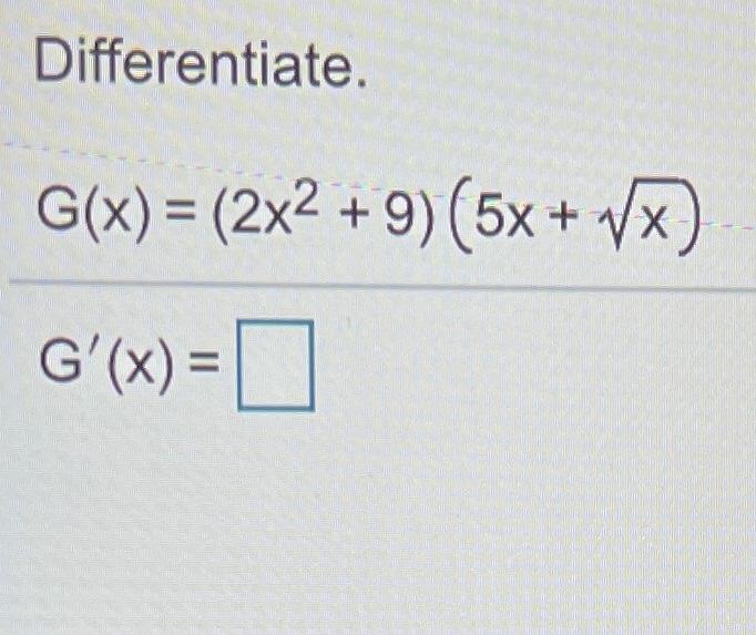 Solved Differentiate. G(x) = (2x2 + 9) (5x + V G'(x) =