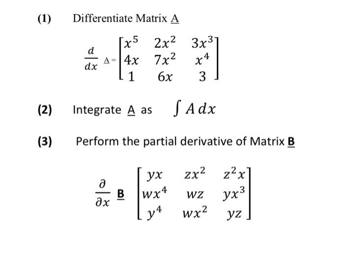 Solved (1) Differentiate Matrix A [x5 2x2 2x2 3x3 d A = 4x