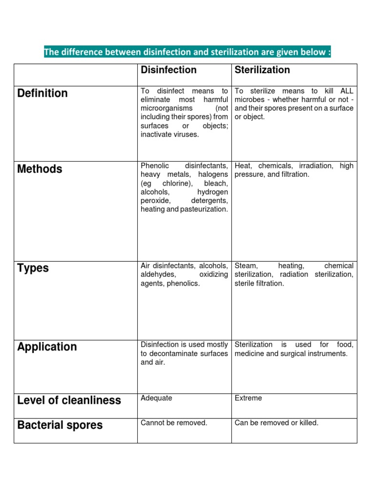 Differentiate Between Sterilization And Disinfection - Disinfection aims to kill or inactivate harmful microorganisms, but leaves some microbes intact. Sterilization can be thought of as the most advanced approach for ensuring the elimination of all pathogenic living forms. Sterilization, on the other hand, aims at.