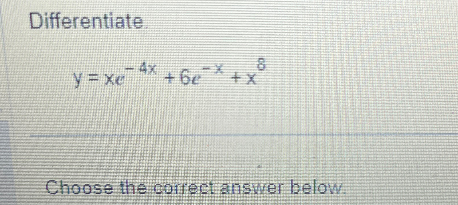 Solved Differentiate.y=xe4x+6ex+x8Choose the correct