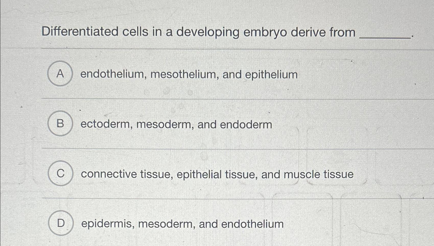 Differentiated differentiated cells in a developing embryo derive from. Endothelium, mesothelium, and epithelium ectoderm, mesoderm, and endoderm connective tissue, epithelial tissue, and muscle. Differentiated cells in a developing embryo derive from _____. After you feel comfortable with your counting method and identifying cells in the various stages of mitosis, use the four images below of whitefish blastula to count the.