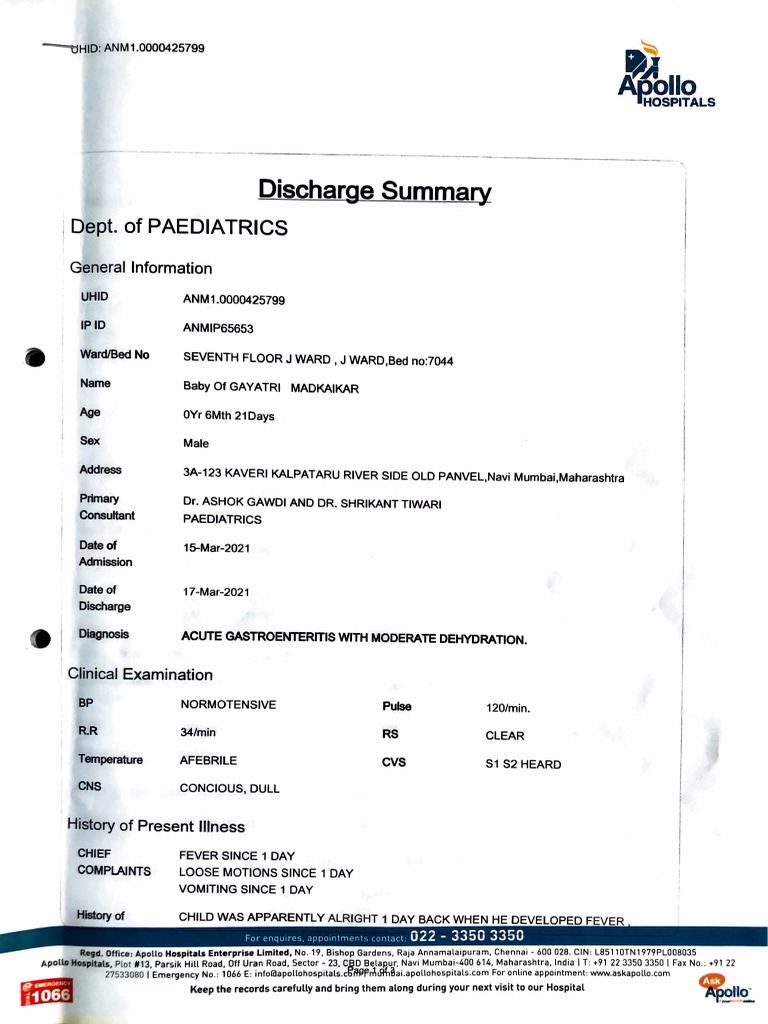 Discharge Summary Dept. of Paediatrics PDF Diarrhea Clinical