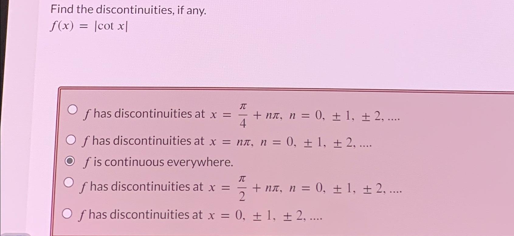 Solved Find the discontinuities, if any.f(x)=cotxf has
