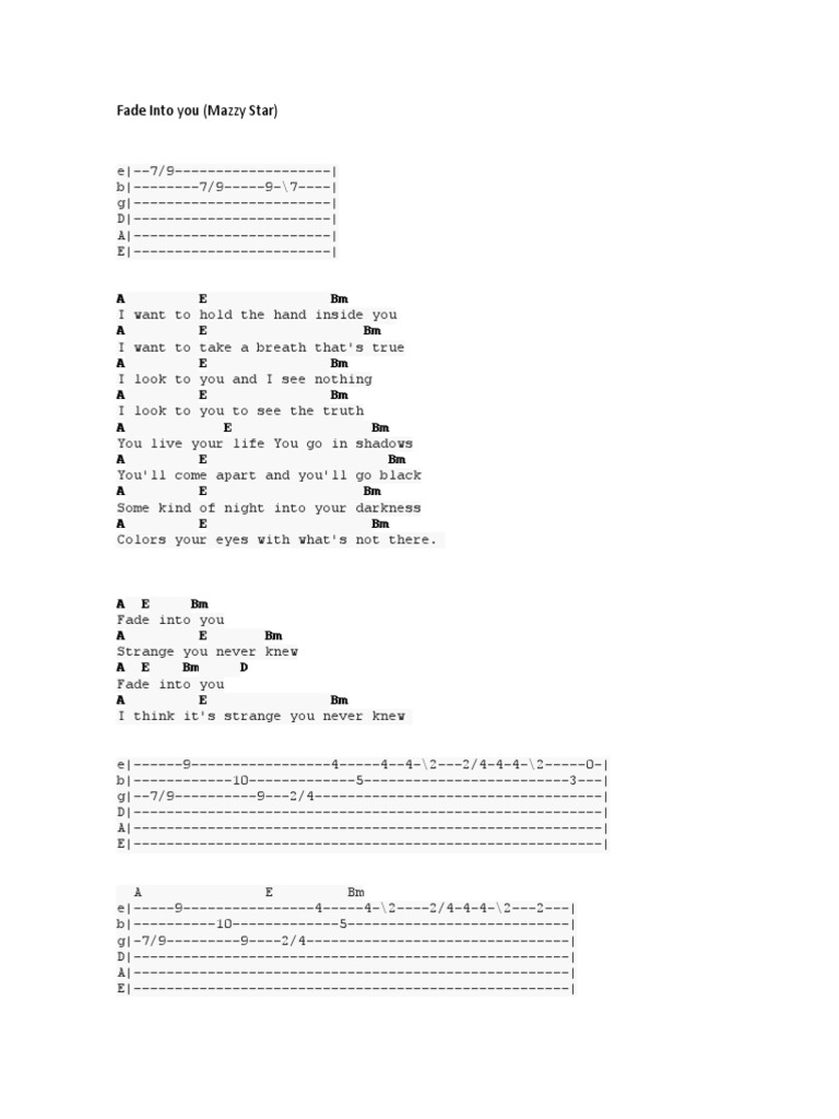 Sheet music for fade into you by mazzy star arranged for piano/vocal/chords in a major. Digital sheet music from musicnotes. Share, download and print free sheet music of fade into you mazzy star for piano, guitar, flute and more with the world's largest community of.