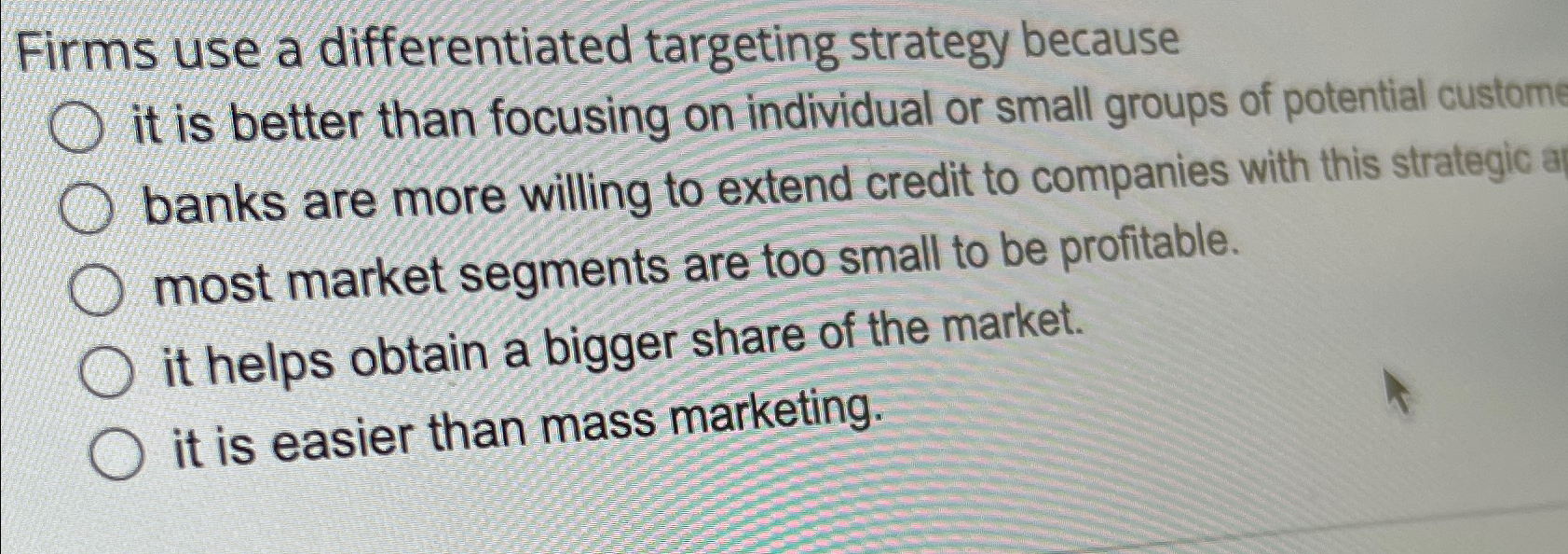 Firms use a differentiated targeting strategy because: A differentiated marketing strategy can be defined as a marketing strategy that allows you to target different business market. One of the benefits of a differentiated targeting strategy is that it allows the firm to diversify its business and a. The firm's offering overlaps with customer needs/wants but not with competitors' offerings. It.