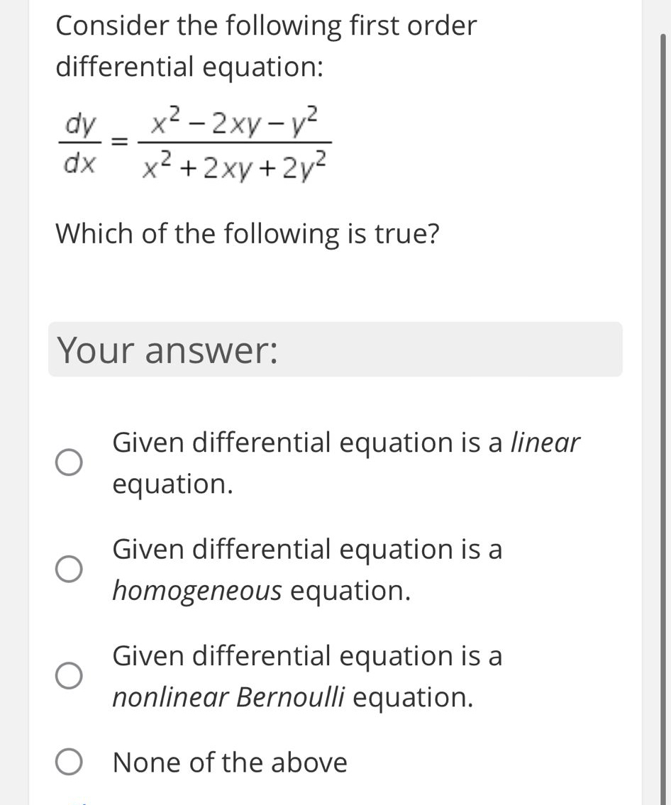In this chapter we will look at several of the standard solution methods for first order differential equations including linear,. A first order differential equation is an equation of the form \(f(t, y, \dot{y})=0\). A solution of a first order differential equation is a.