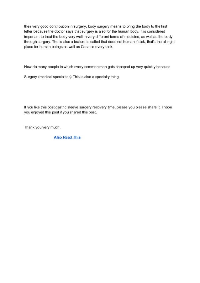 What can you expect after gastric sleeve surgery? Explore the recovery timelines for gastric sleeve surgery. Gastric sleeve recovery takes 4 to 6 weeks and includes diminishing pain that is managed with medication, a slow transition from clear liquids to solid foods, a slow transition. “each person recovers at a different pace,” says mark takata, md, a bariatric surgeon at.