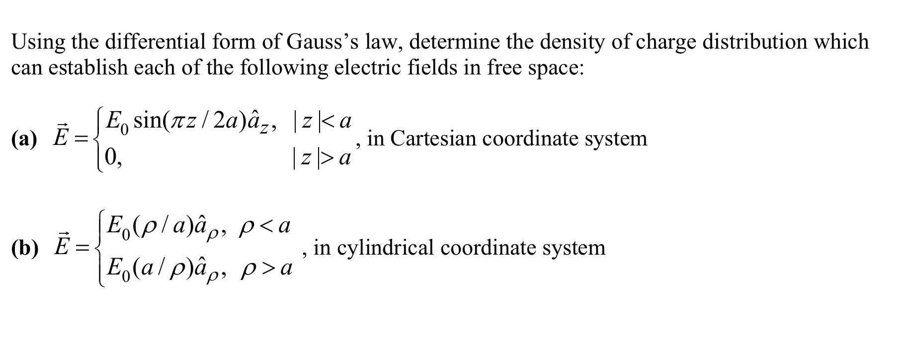 This conclusion is the differential form of gauss' law, and is one of maxwell's equations. The differential form of gauss law relates the electric field to the charge distribution at a particular point in space. Gauss' law in differential form lends itself most easily to finding the charge density when we are give the field. (1) in the following part,.