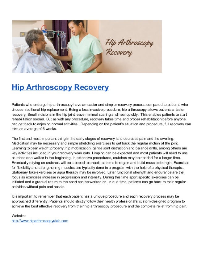 The recovery time for hip arthroscopy is usually between six to 12 weeks. Your exact timeline will depend on why hip. Most people get better in about six weeks after having a hip arthroscopy. You may have to limit your. You will probably need about 6 weeks to recover.