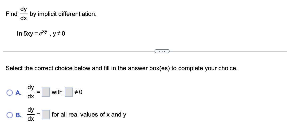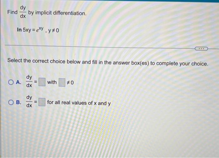 Solved Find dxdy by implicit differentiation. ln5xy=exy,y =0