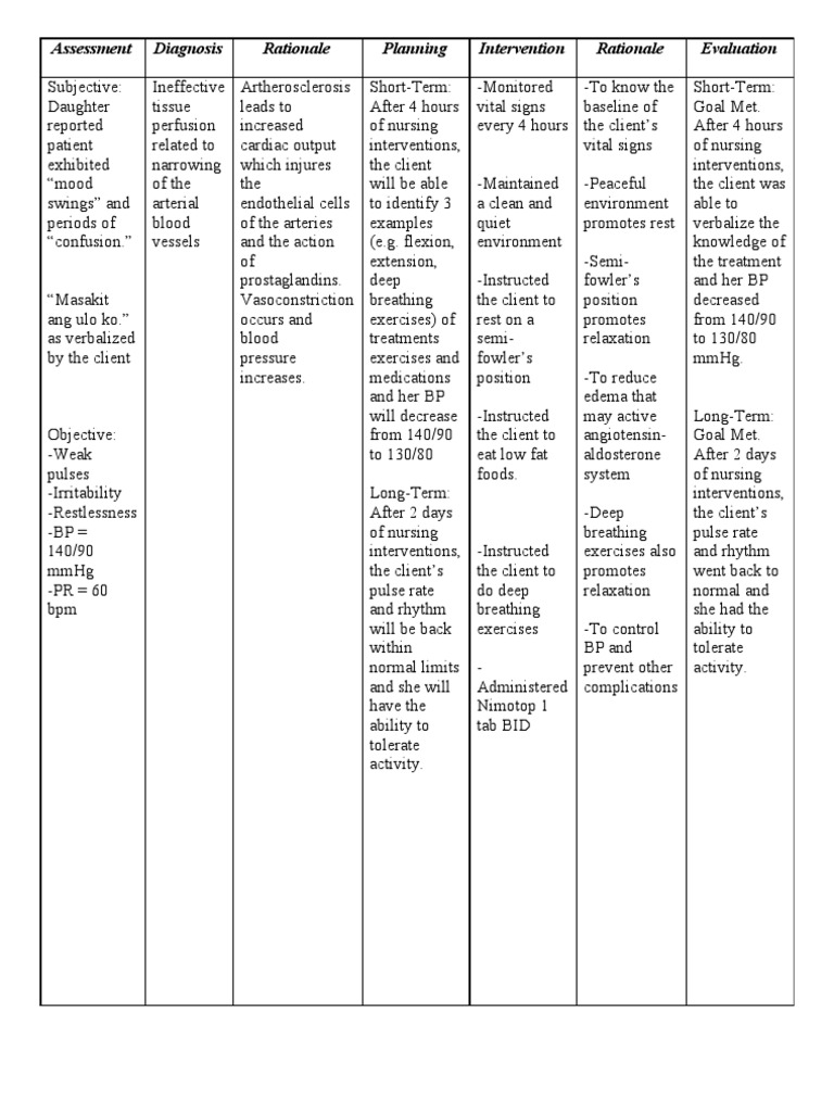 Nursing Care Plan Risk For Ineffective Tissue Perfusion NBKomputer