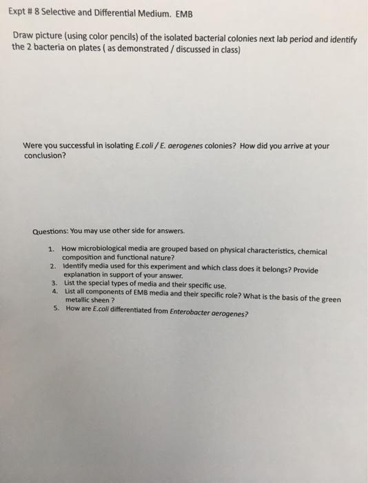 Solved Expt 8 Selective and Differential Medium. EMB Draw