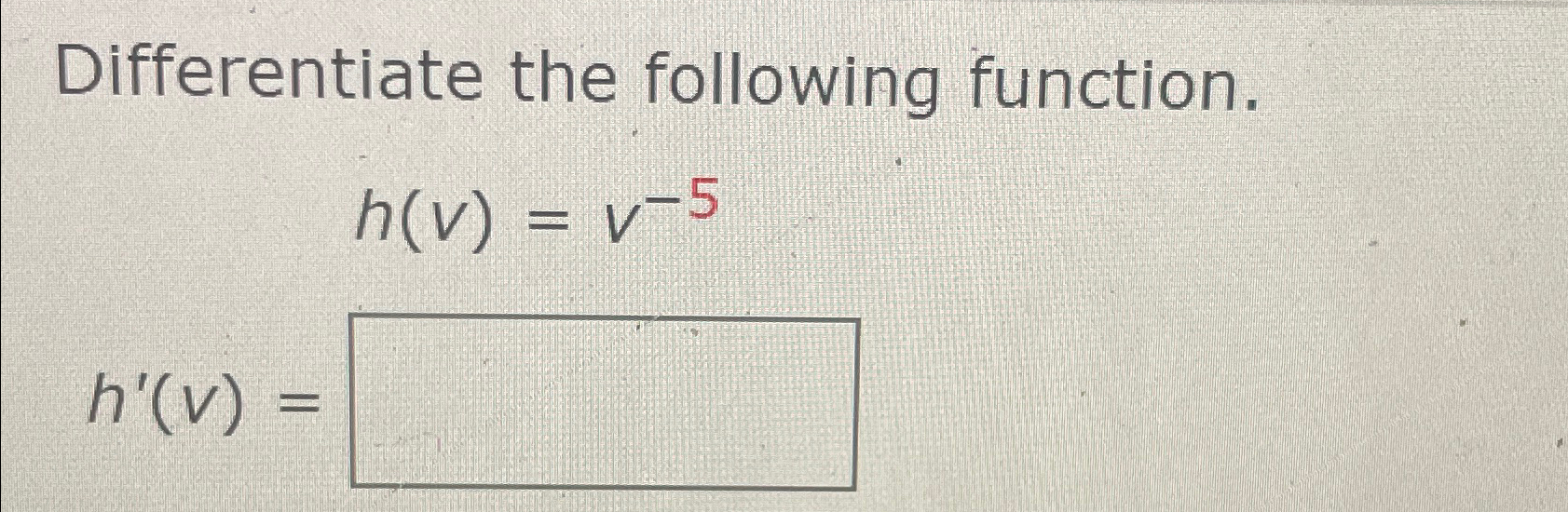 Solved Differentiate the following function.h(v)=v5h'(v)=
