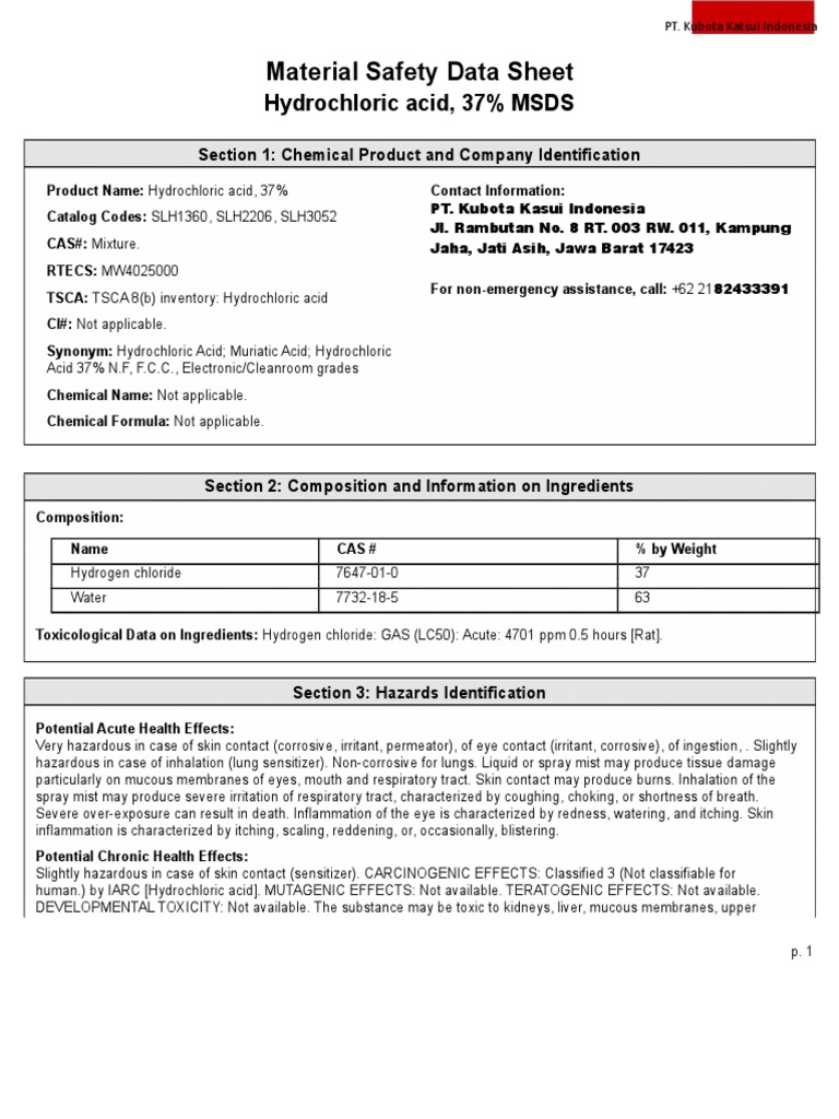 Material Safety Data Sheet Hydrochloric Acid, 37 MSDS Descargar