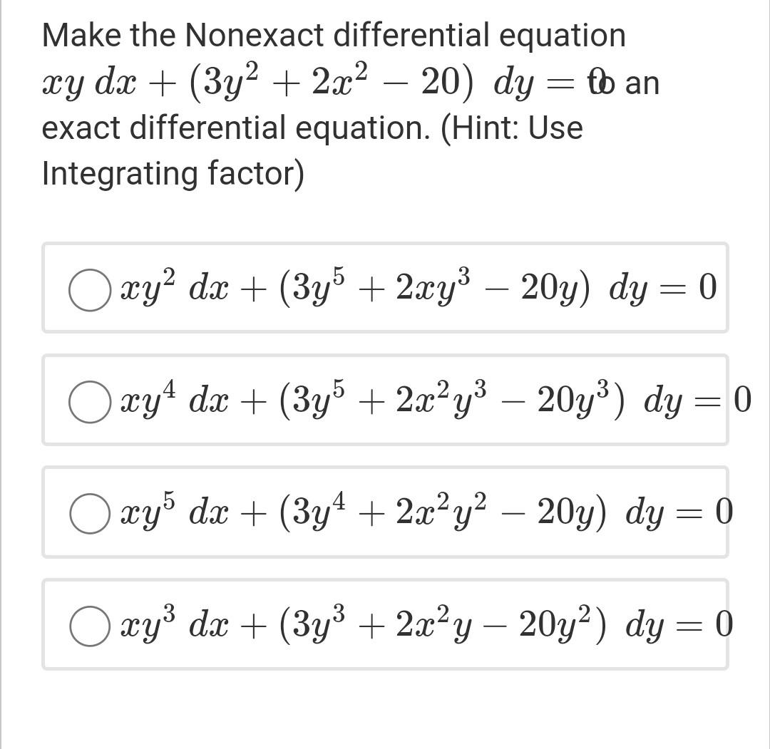 Solved Make the Nonexact differential equation xy dx + (3y2