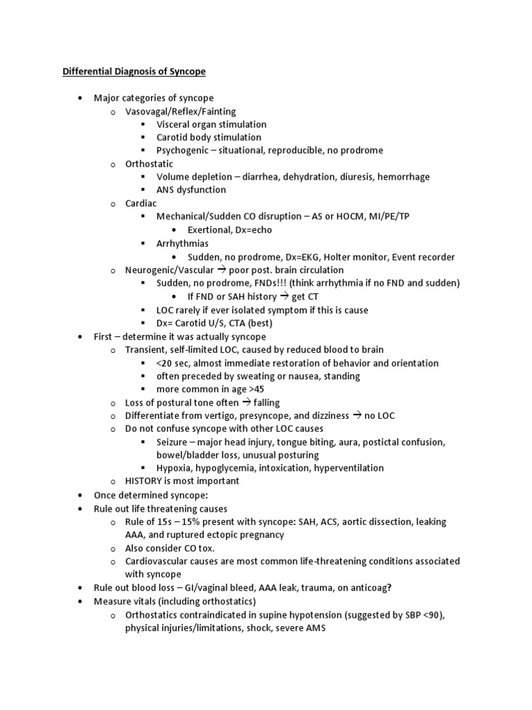 Differential Diagnosis of Syncope Cardiovascular System Symptoms