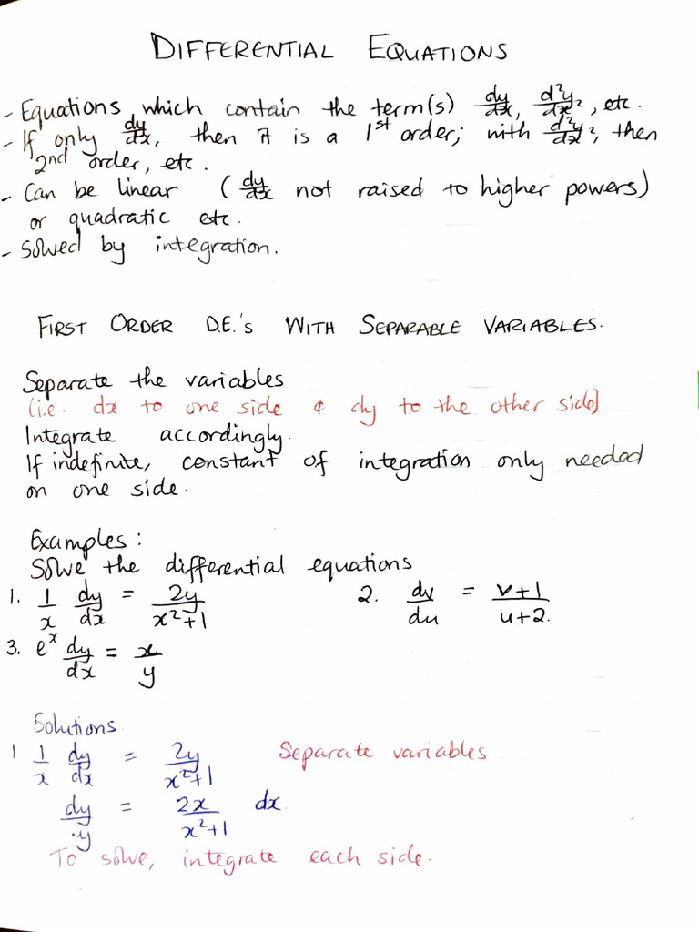 Methods for first order differential equations including linear, separable, exact and bernoulli.