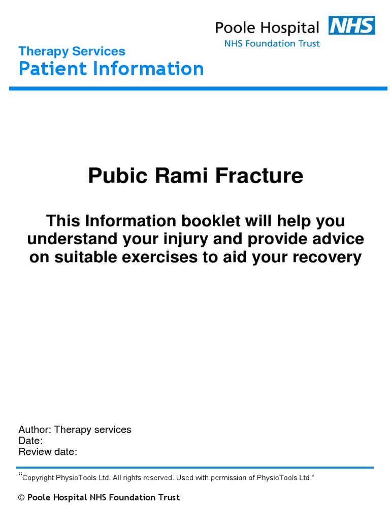 It may take up to 8 weeks to recover from a pubic ramus fracture. Use your hands on the arms of chairs to support getting in and out of a chair. It is important to take regular pain relief throughout the day, as guided by the doctor. • here are some exercise which will help your. A stable pelvic fracture.