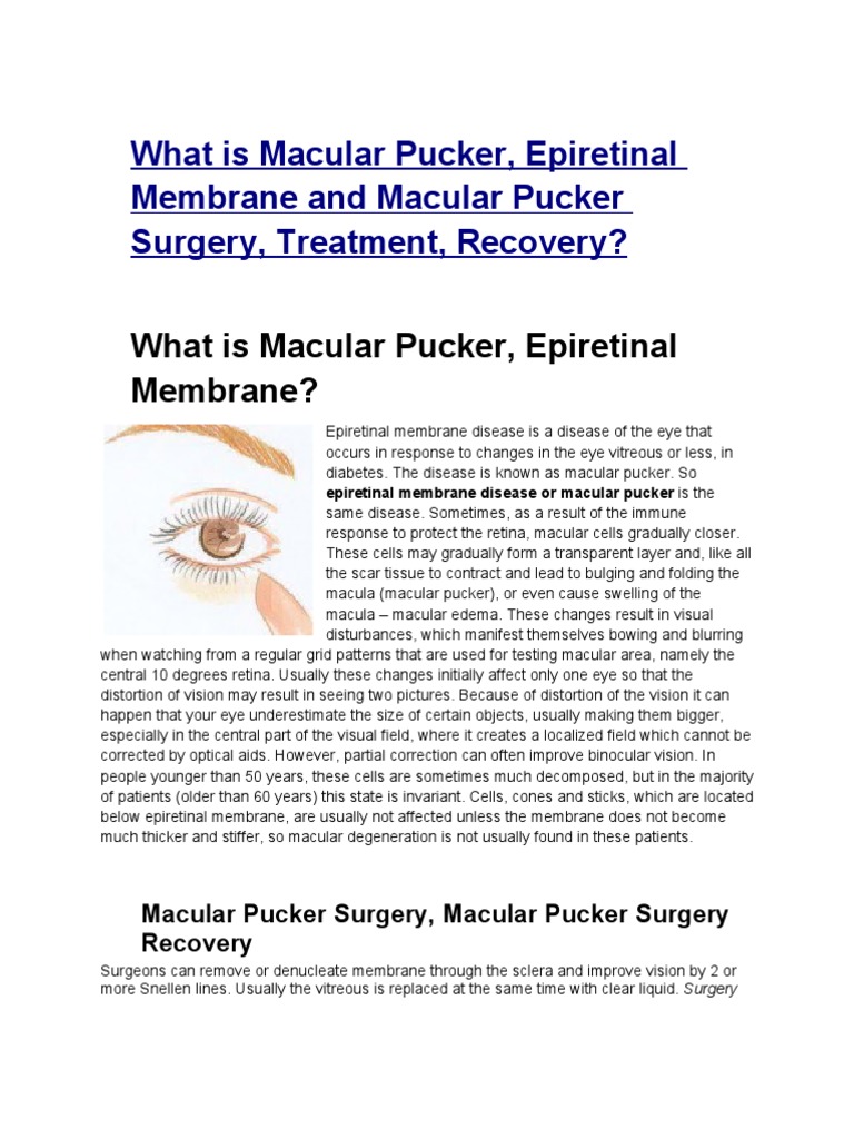 The operation time for an epiretinal membrane/macular pucker surgery usually ranges from 20 to 30 minutes, but this is not an. Recovery from epiretinal membrane surgery: Vitrectomy surgery for epiretinal membrane is safe and painless. The recovery process after epiretinal membrane surgery typically involves avoiding strenuous activities and taking eye. Your vision will never return to.