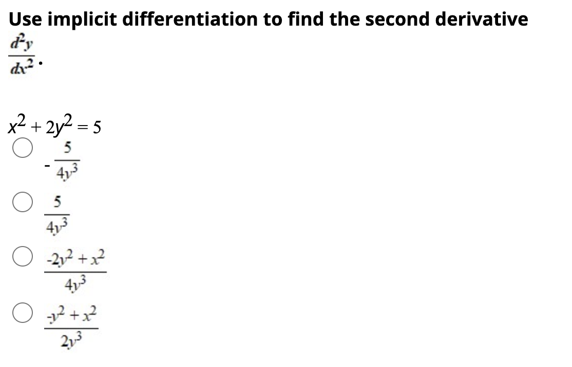 Second Derivative Implicit Differentiation Calculator - The second implicit derivative calculator is a powerful tool for mathematicians and students studying calculus. The implicit differentiation calculator will find the first and second derivatives of an implicit function treating either $$$ y $$$ as a function of $$$ x. Easily compute implicit derivatives with our calculator.