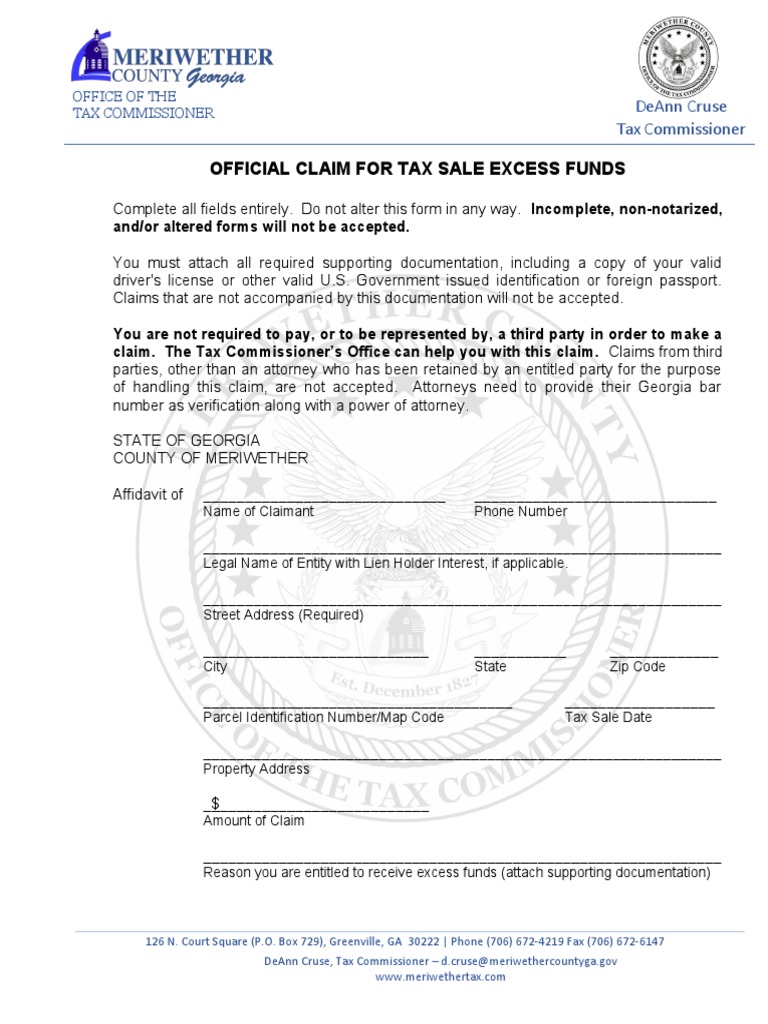 The attached form can be used to claim the excess proceeds from a tax deed sale by a. Any claim by an assignee must also include an affidavit and assignment from the party. Linn county real property surplus funds claim form please complete all sections of this. This guide contains forms and instructions for a motion for disbursement of surplus funds,.