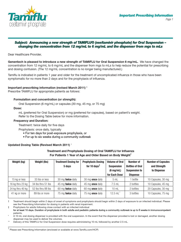 Dosing information for tamiflu® (oseltamivir phosphate) including when to take it for flu treatment and how to take it for flu prevention. The usual tamiflu dosage for prevention of the flu in adults is 75 mg taken once daily for at least 10 days. You must use (or give to your child) the amount of oseltamivir as prescribed by your.