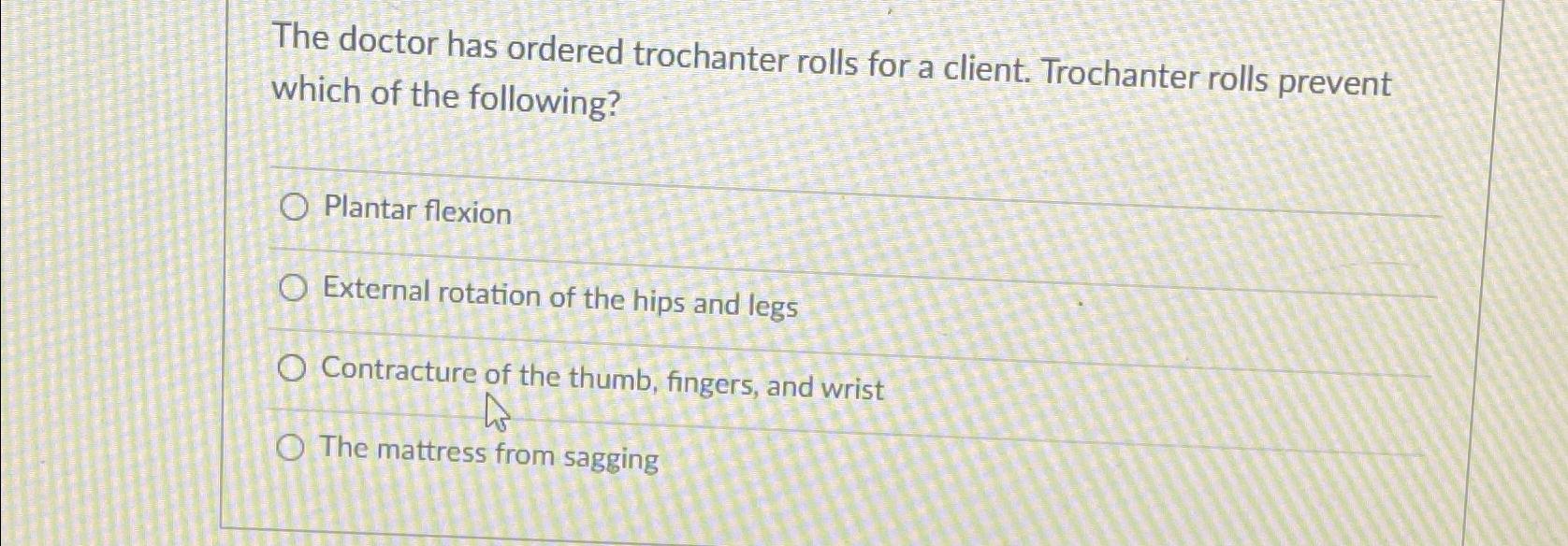 This can help to prevent contracture,. A trochanter roll is a device that is placed alongide the patient’s legs to prevent external rotation of the hips. Use trochanter rolls and pillows to aid in patient comfort and relieve pressure points. Tendelenburg is accomplished by lowering the head of bed. A trochanter roll is a cushion tool that supports the hip.