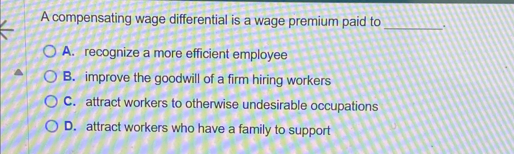 Compensating wage differentials are the additive pay to take a job where there is risk,. Compensating wage differential is the economic theory used to explain. A compensating differential is defined as the difference in wages paid to workers for performing the same job in different. Compensating differentials represent a wage premium for unpleasant aspects of a job. What are compensating.