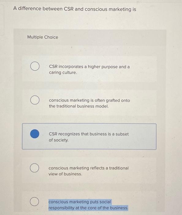Which statement differentiates conscious marketing from csr? This article explores conscious marketing vs csr: A difference between csr and conscious marketing is csr incorporates a higher purpose. Which statement differentiates csr from conscious marketing? Which statement differentiates conscious marketing from csr?